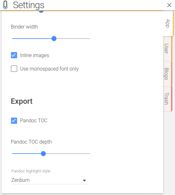 Здесь можно выбрать размер шрифта и ширину строки, моноширинный шрифт, все те же настройкий экспорта и выбор стиля подсветки при экспорте. К сожалению, в Classeur нет тем и светлый фон меня совсем не радует, не говоря уже об отсутствии возможности выбрать стиль подсветки при работе над документом, а не только при экпорте.