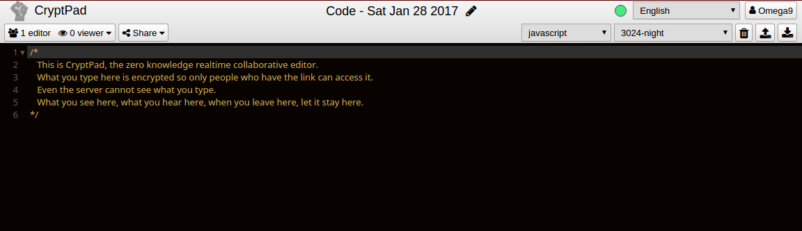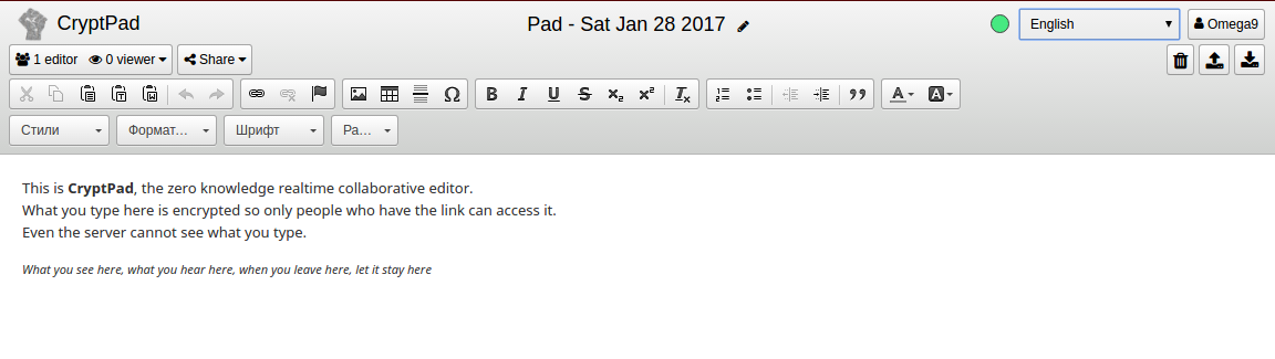 Cryptpad очень похож на один из Etherpad’ов и я не могу быть уверен, что это не доработанная под свои нужды ветка. На главной странице нам предлагают выбрать rich text pad и code pad.