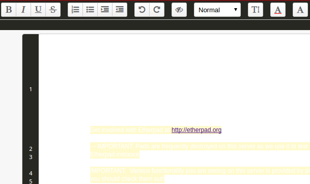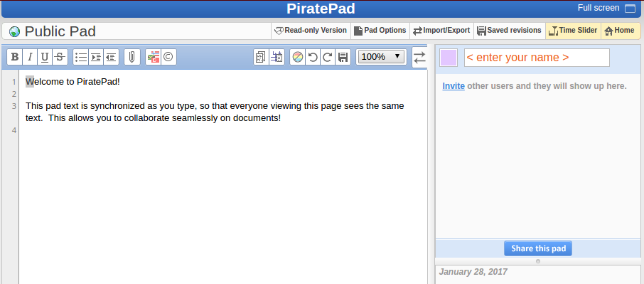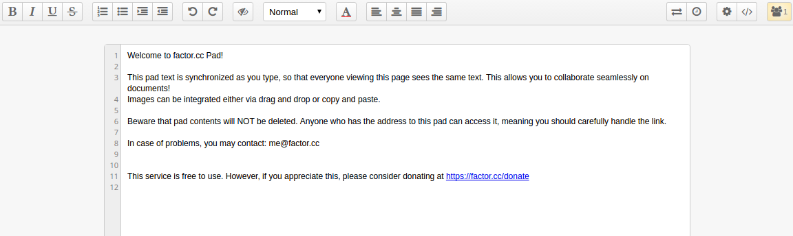 FACTOR.CC предоставляет версию Etherpad посвежее, отличающуюся чуть расширенной в сторону html разметкой, отсутствием импорта документов Word, большим количеством доступных шрифтов против всего двух у PiratePad, и переведенным на разные языки интерфейсом, который не сказать, что вообще нуждается в переводе. Еще есть возможность встраивать отдельные документы через <iframe> куда вам вздумается.