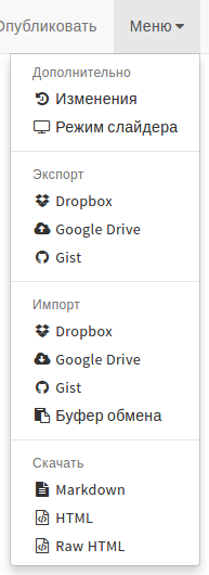 Экспорт из Dropbox, Google Drive и Gist. Импорт туда же или в буфер обмена.