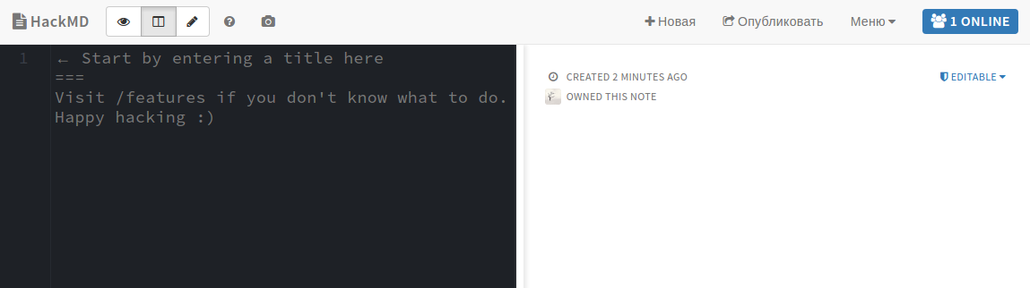Меня встречает такой же разделенный экран, как у StackEdit, но несколько проще.