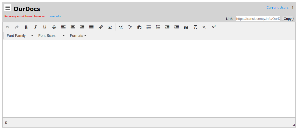 Еще одним подобным Etherpad сервисом является OurDocs, который на фоне всего перечисленного примечателен только тем, что он уж точно не явлется одним из них. Функциями не богат, необходимых мне в нём нет, не считая, конечно же, совместной работы, но я помещу его в обзор для разнообразия.