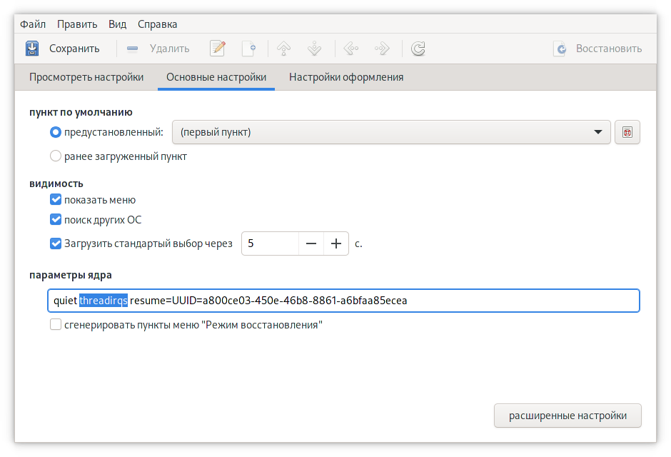 threadirqs. Подробнее об этом можно почитать здесь, но если не терпится и хочется попроще, то ставим Grub Customizer (пакетgrub-customizer), открываем вкладку “Основные настройки” и добавляемthreadirqsв строку с параметрами ядра: