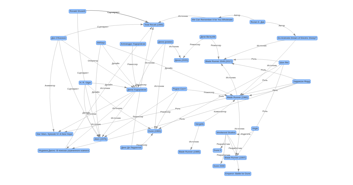 Прежде я смотрел замечательную документалку о Дюне Ходоровского — фильм, который так и не был снят, но даже не смотря на это все же существует в какой-то своей особой форме. После просмотра документалки мне завалилось в голову разных имен, каких-то исторических фактов и всего прочего, о чем я как-то и не собирался даже вспоминать, когда сел пересматривать Blade Runner. Но нет, тут-то всё и стало всплывать одно за другим. Началось это, как я уже сказал, с Шон Янг. Затем этот медленный полет над городом, пейзажи, пирамидальные дома. Я даже не вспомню сейчас, не пересмотрев, было ли что-то точно такое на набросках Мёбиуса или Гигера для Дюны, было ли в Чужом О’Бэннона, было ли вообще где-то (не исключаю, что такие сцены диктуются расхожими в то время методами производства и общим реквизитом для разных фильмов), но ассоциативно это что-то да всколыхнуло и я стал вспоминать кто где и когда как поучаствовал, а когда полез почитать обо всех этих фильмах, в голове уже было достаточно для того, чтобы как-то это оформить.